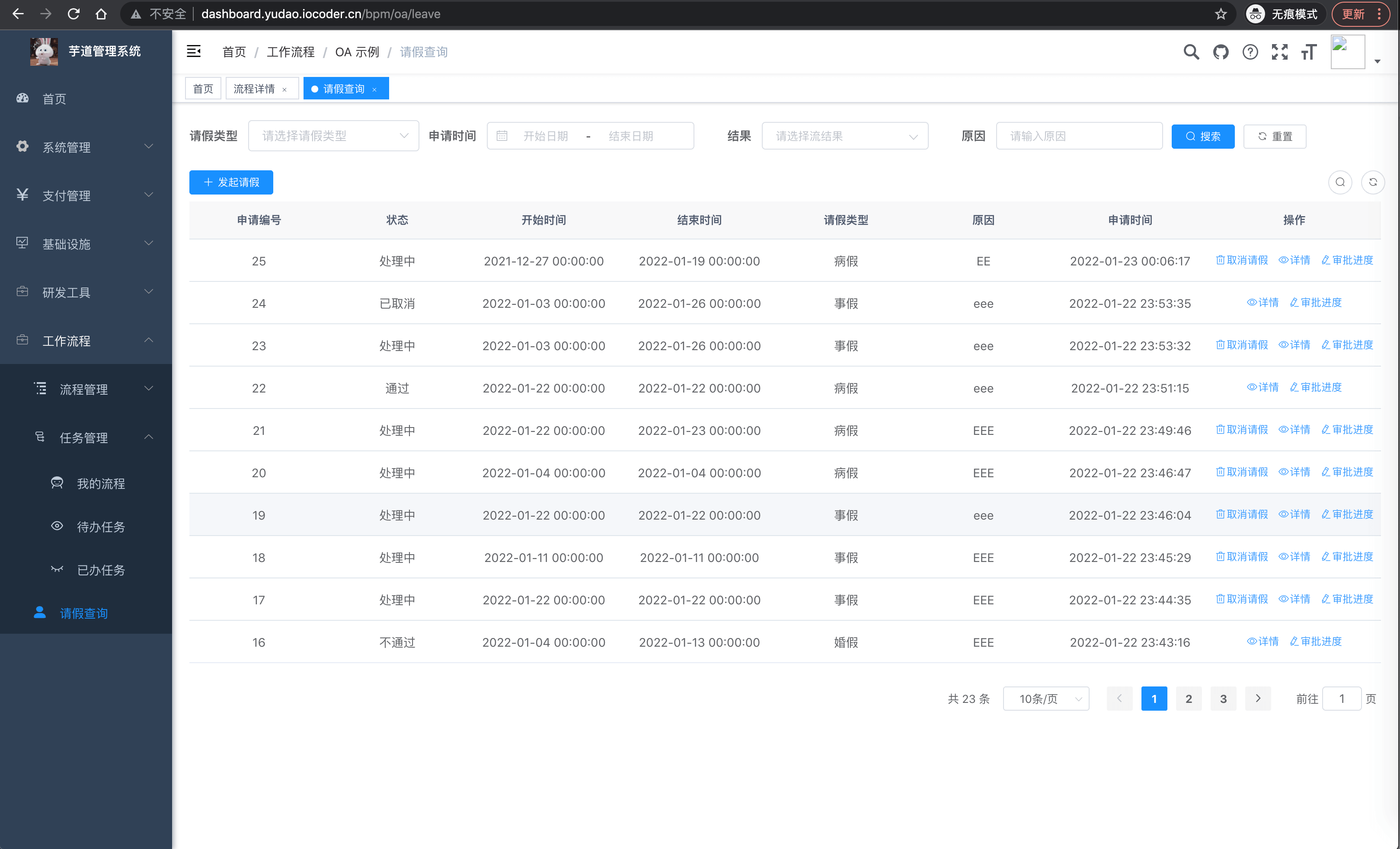 | 🚀 | OA 请假 | 作为业务自定义接入工作流的使用示例,只需创建请求对应的工作流程,即可进行审批 |