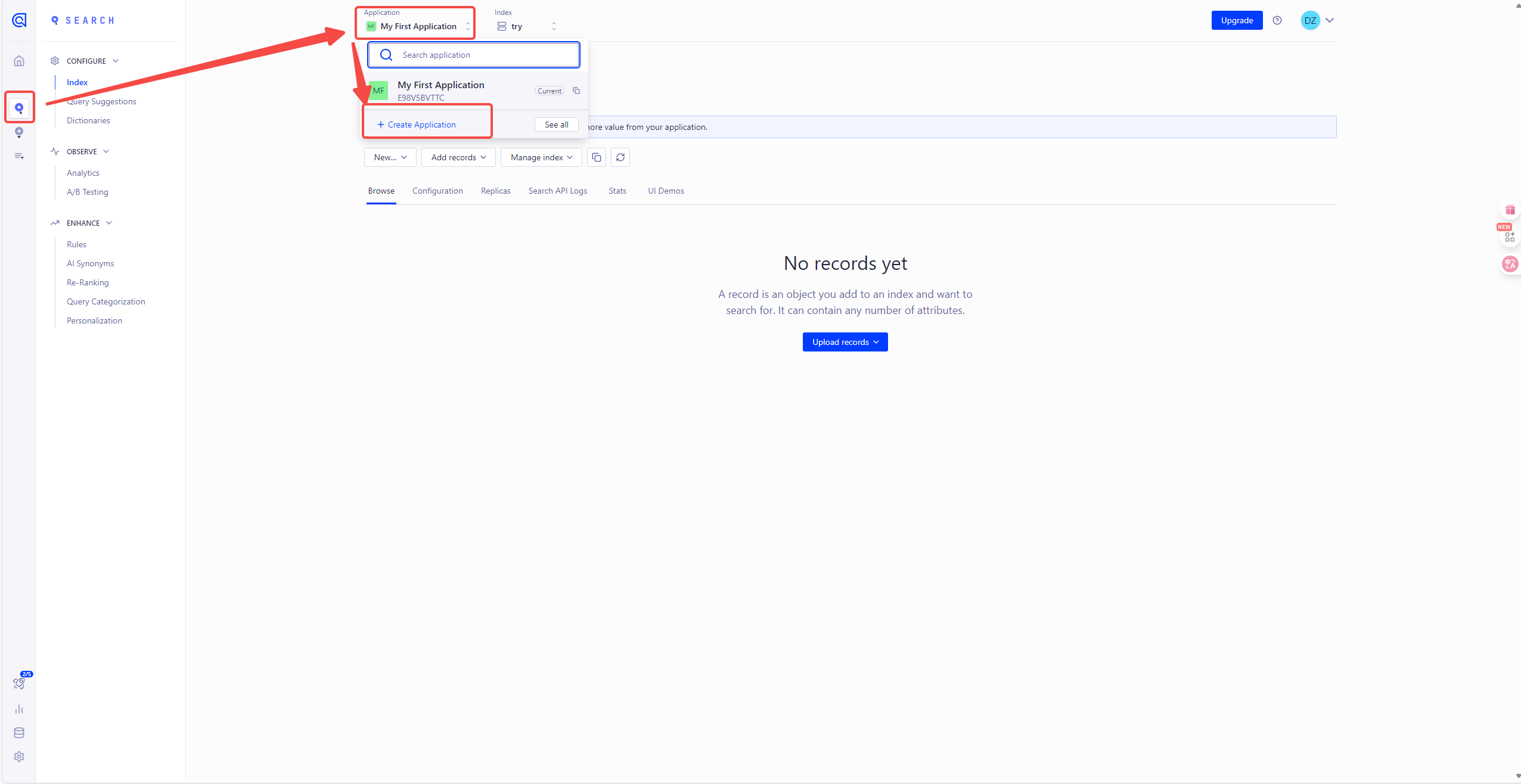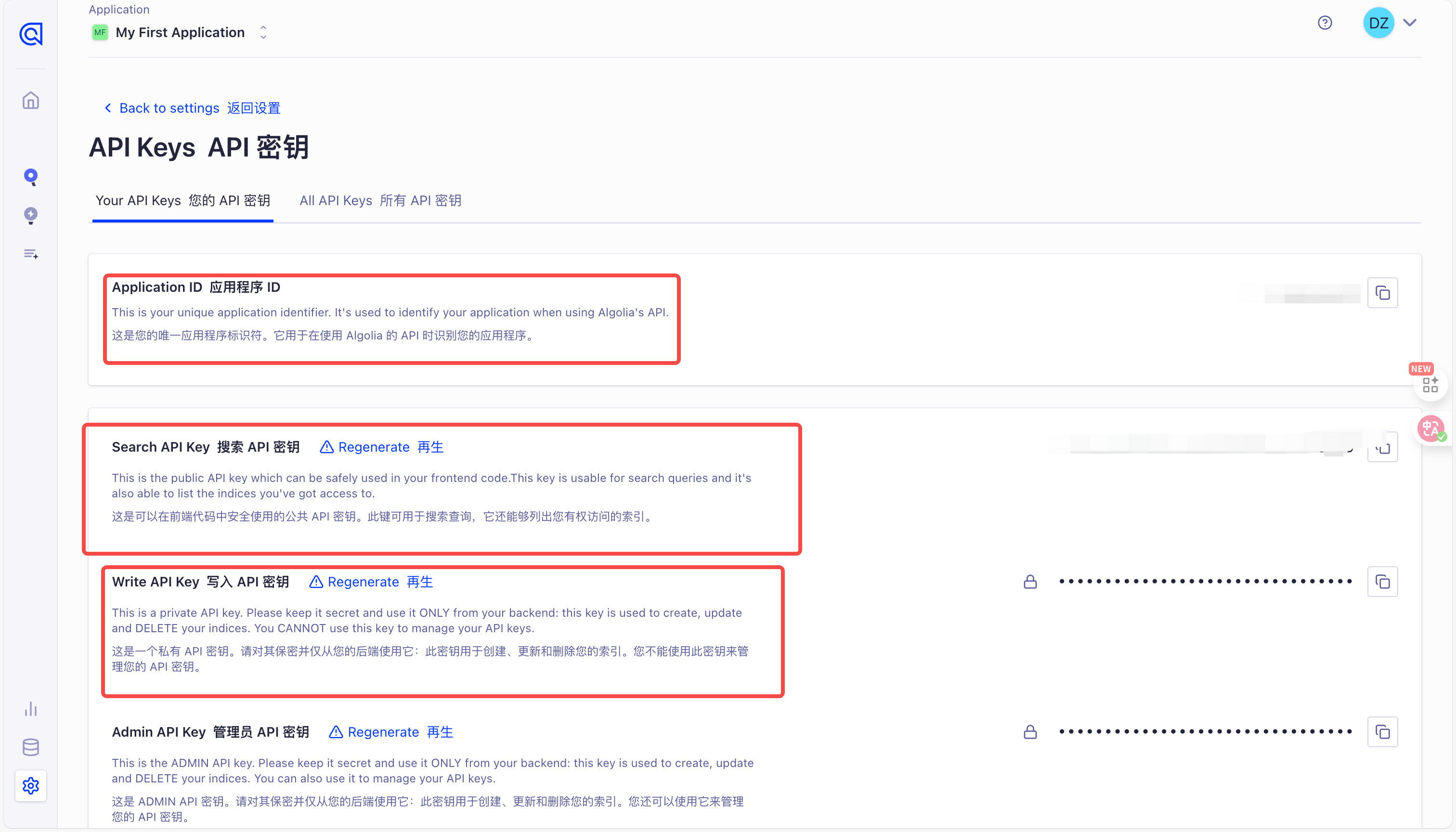 页面中的Application ID和Search API Key,Write API KEY就是环境变量对应的NEXT_PUBLIC_SEARCH_APPID和NEXT_PUBLIC_SEARCH_APPKEY,SEARCH_APPWRITEKEY