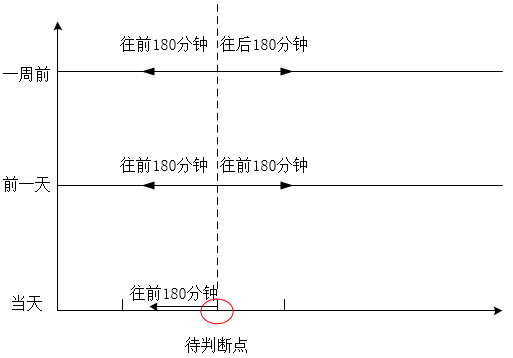 针对当前一个值的检测,需要依赖过去三段数据,数据选取规则参考示例图: