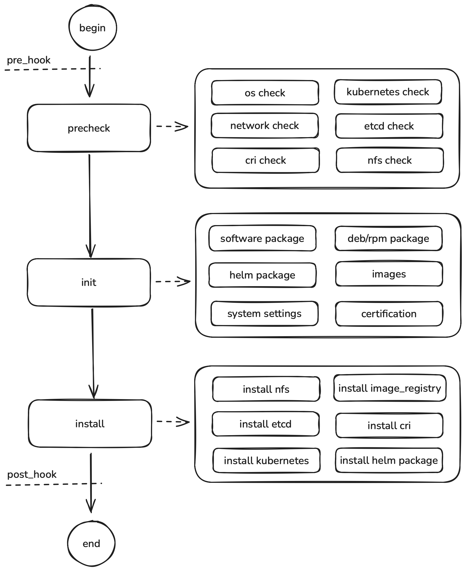 - 离线包构建: 当配置离线安装时,将所有依赖资源(二进制文件、镜像、Chart 包等)打包成完整的离线安装包