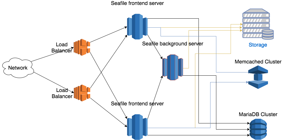 - Load balancer tier: Distribute incoming traffic to Seafile servers. HA can be achieved by deploying multiple load balancer instances.