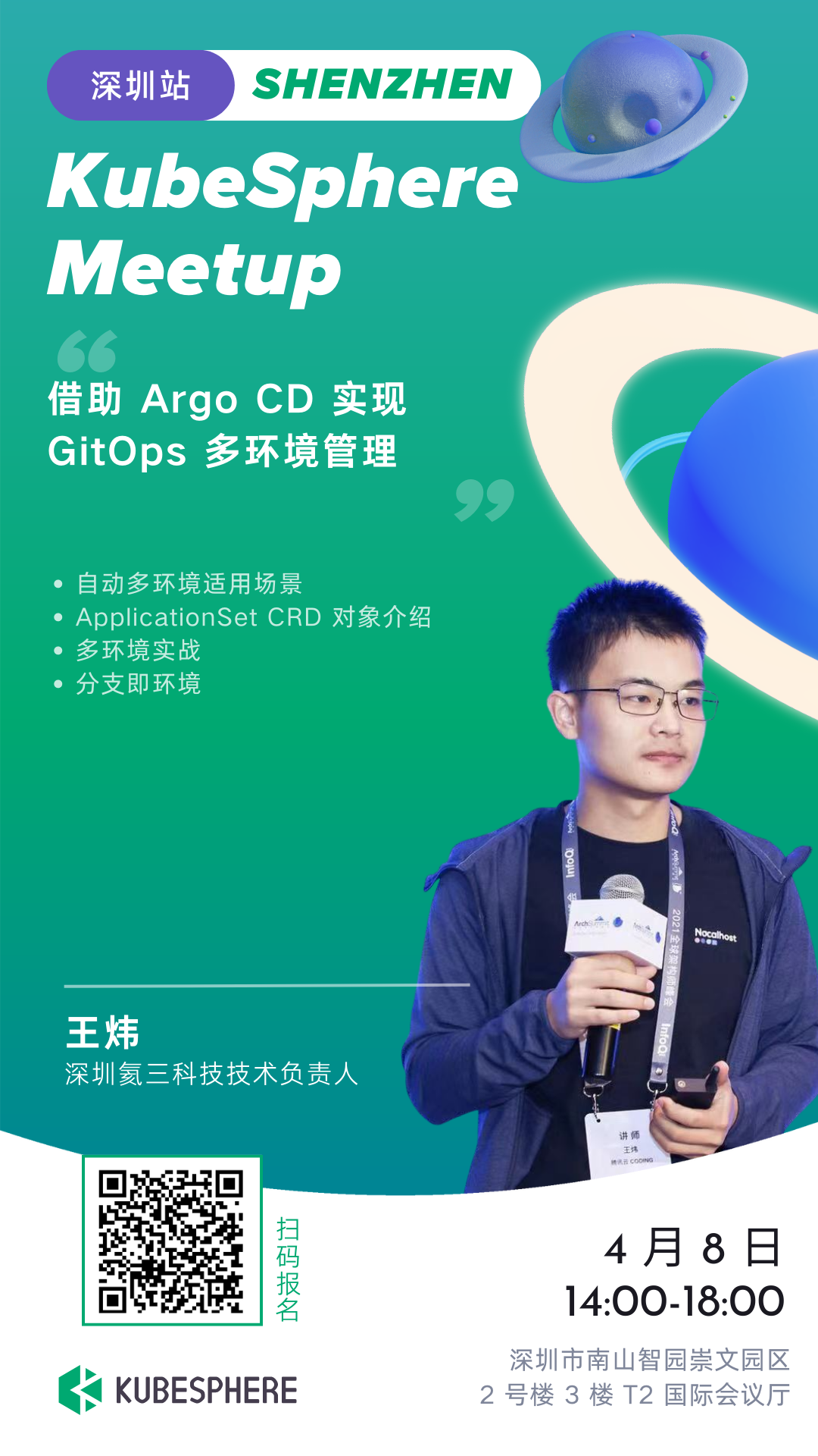 description: 本次分享介绍了如何使用 Argo CD Generators 和 ApplicationSet 自动管理多套 K8s 环境,并实现“代码即环境”的统一管理方式。此外,还简单介绍了 KubeSphere 的 DevOps 能力以及开发者工具箱 He3。