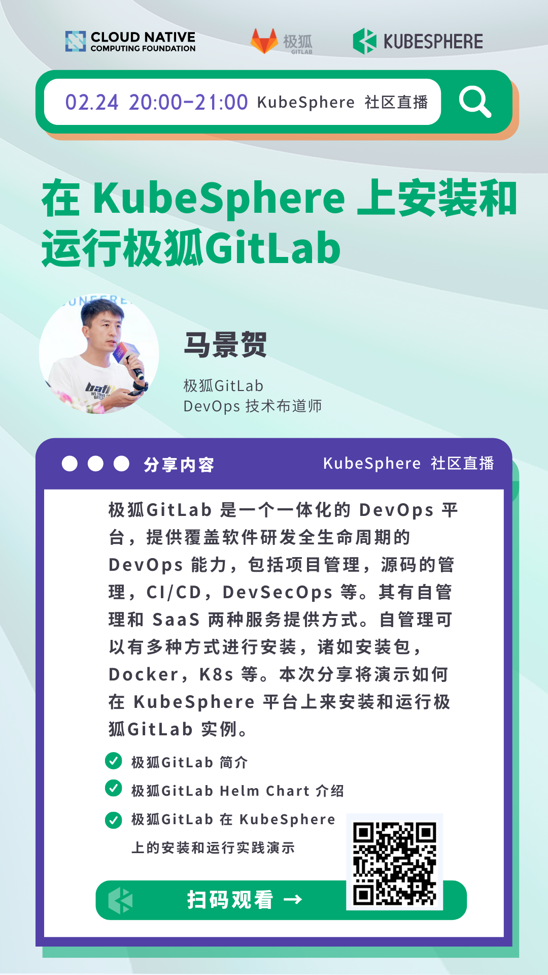 极狐GitLab 是一个一体化的 DevOps 平台,提供覆盖软件研发全生命周期的 DevOps 能力,包括项目管理,源码的管理,CI/CD,DevSecOps 等。其有自管理和 SaaS 两种服务提供方式。自管理可以有多种方式进行安装,诸如安装包,Docker,K8s 等。本次分享将演示如何在 KubeSphere 平台上来安装和运行极狐GitLab 实例。