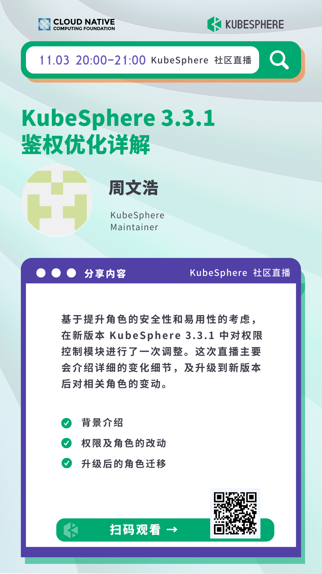 可扫描官网底部二维码,关注 「KubeSphere云原生」公众号,后台回复 `20221027` 即可下载 PPT。