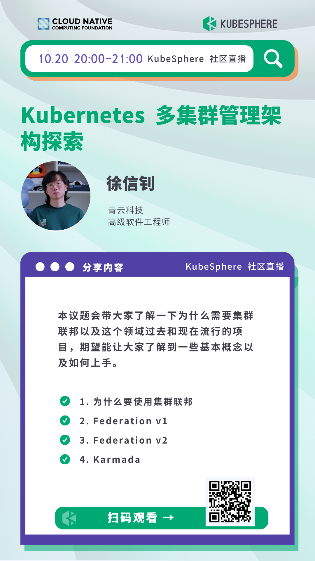 徐信钊,青云高级软件工程师,目前负责维护 KubeSphere 多集群等模块。